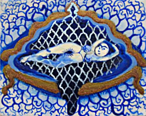 Second Generation Iranian artist Negar Ahkami incorporates Middle Eastern and Western iconography in her work using a variety of materials from temporary tattoos to acrylic paintings that look like ceramic tiles.