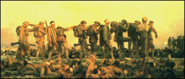 When the guns were silenced at eleven o’clock on the morning of November eleventh 1918, Sargent’s enormous canvas was almost finished. The maiming and dying was over; the war had cost the Allies over five million men, the Central Powers three and a half million. Over one million British and Commonwealth soldiers had given their lives. "Gassed" was exhibited at the Royal Academy in 1919, and there were reports of viewers fainting at the sight of it. It hangs permanently in the Imperial British War Museum in London, but it also traveled the world in many major Sargent exhibits during the twentieth century. It became, and still is, one of the most memorably haunting images of the Great War, and in a sense of all wars, being both realistic and allegorical in its appeal to the viewer.