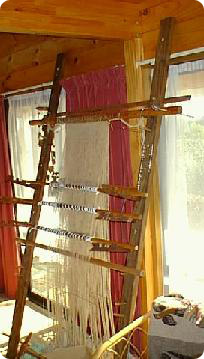 I held the pink bottle reverently for a minute and then placed it carefully back on the window sill. As I turned around, a large wooden object in the next room caught my eye. It was a giant loom, partly strung with red woolen threads. On the parquet floor at its base, skeins of nubby wool filled a wicker basket -- loose strands escaping over its rim like springy red and orange worms.