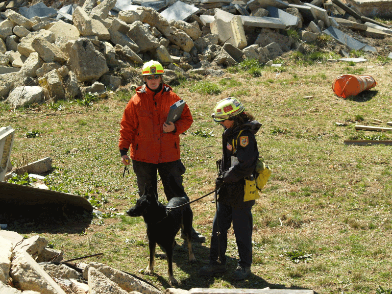 Handler Heritage briefing prior to beginning rubble search   Handler Heritage rewards canine Czaro after rubble search