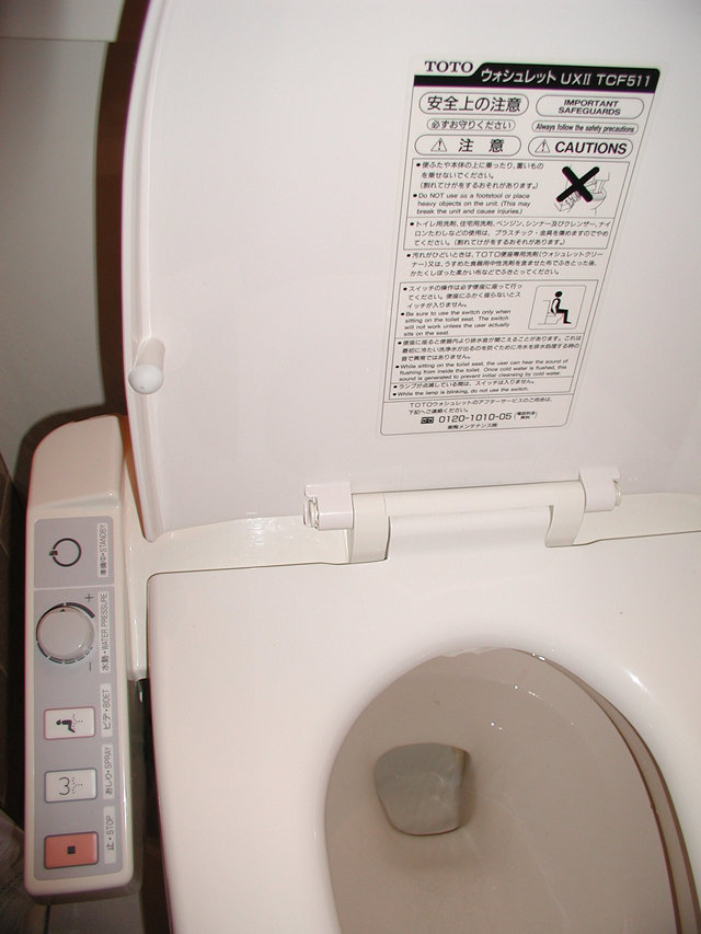 Toillette luxueuse dans notre chambre d'hotel à Kyoto, avec instructions. Fancy toilet found in our hotel room in Kyoto, with instructions on how to use it.